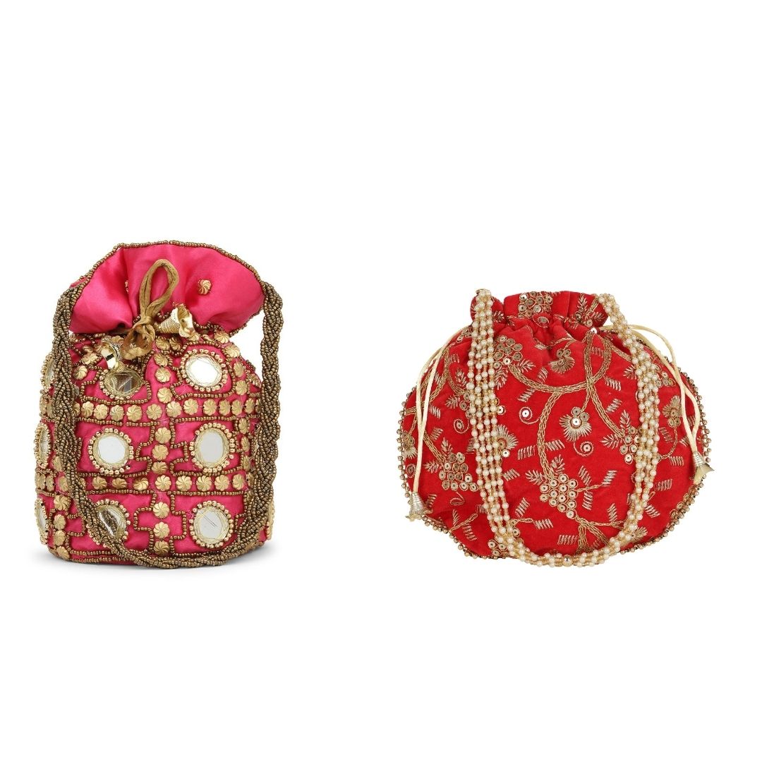 Combo - Designer Embroidered Potli Bag - Red & Pink
